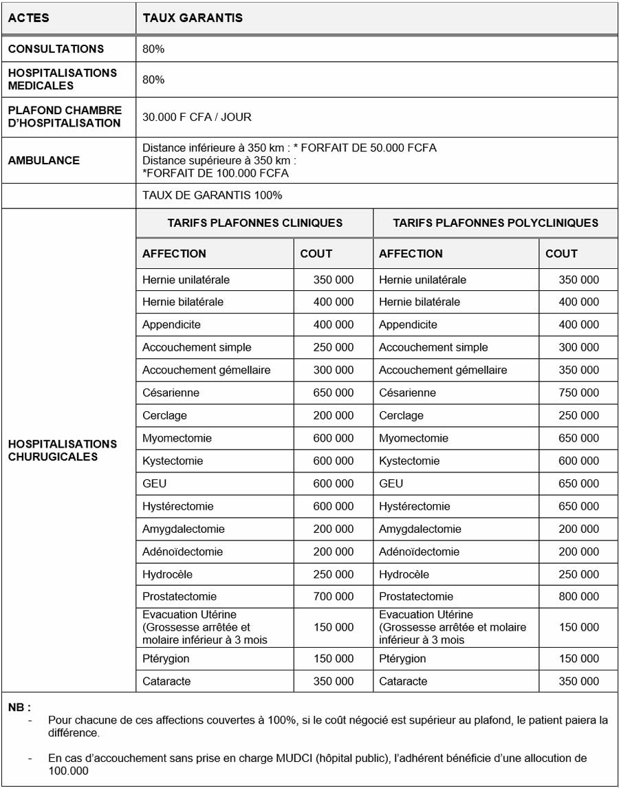 NB : Les frais liés à la grossesse et ceux occasionnés après l’accouchement jusqu’à la consultation post-natale seront pris en charge pour les mutualistes de sexe féminin et pour les conjointes déclarées par les mutualistes de sexe masculin après un délai de carence de neuf (09) mois à compter de la date d’adhésion.